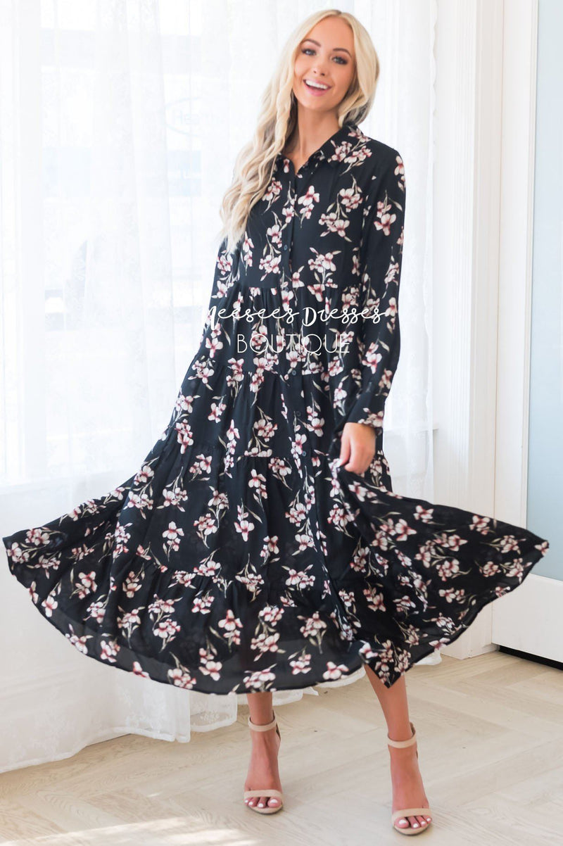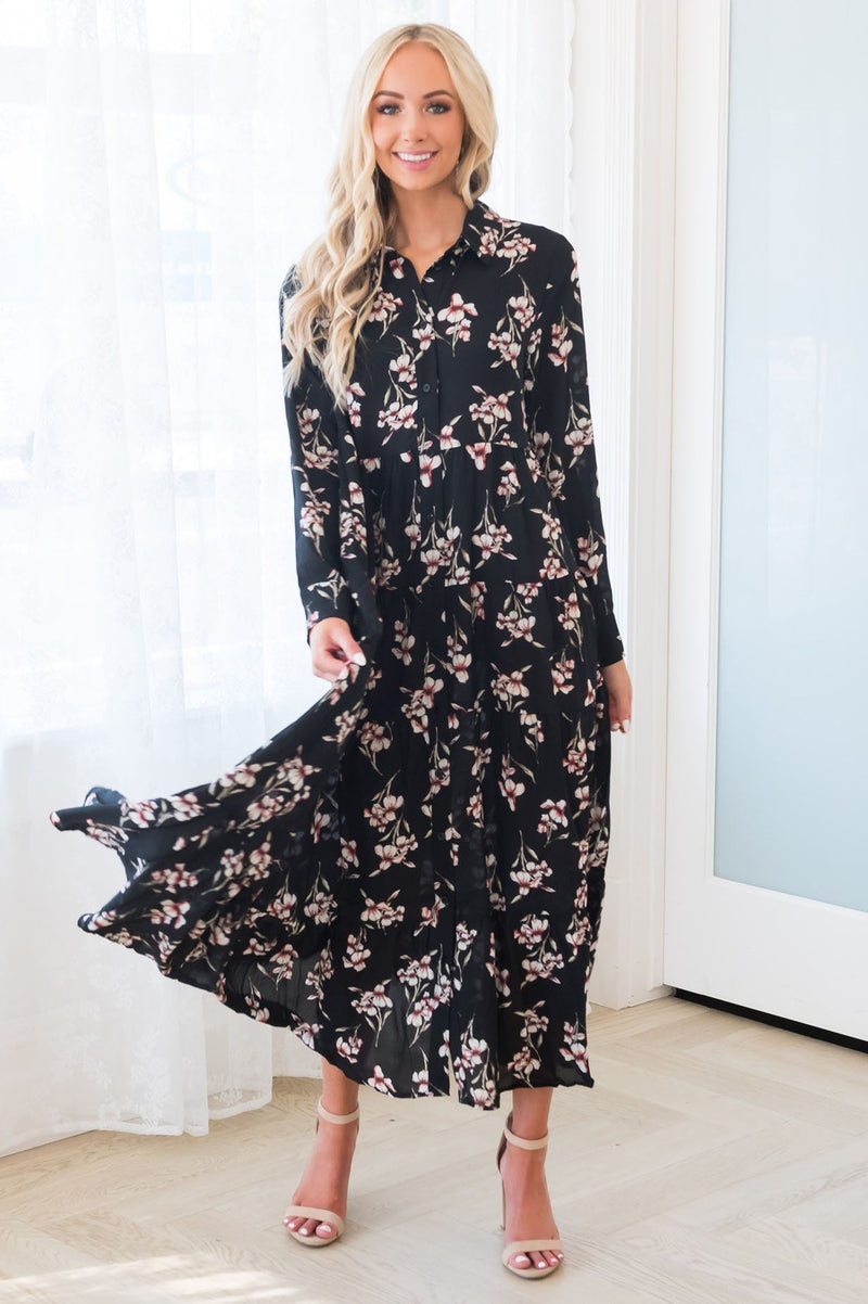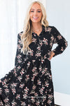 The Dovie is the most gorgeous tier maxi dress we have seen in ages! We love that is also features fully functional button front to make this beauty oh so stylish and nursing friendly. Also features long cuffed sleeves and an absolutely stunning floral print. Get yours before they are all gone!