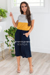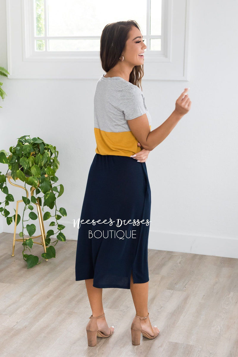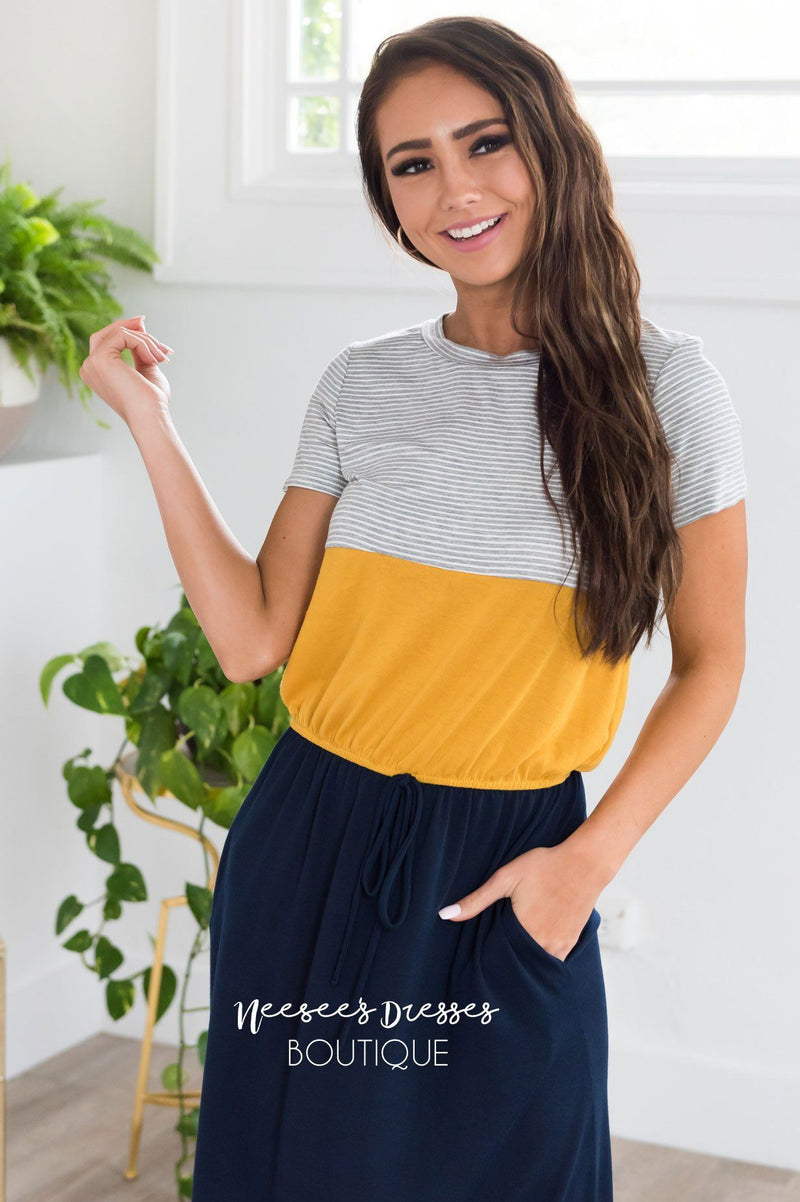 Talk about our new favorite casual summertime dress! This lovely new arrival has us seeing stars! Featuring a rounded neckline, lightweight breathable material, short sleeves, elastic waist with faux tie detail, and a flowy skirt with modest hemline side slits.