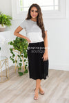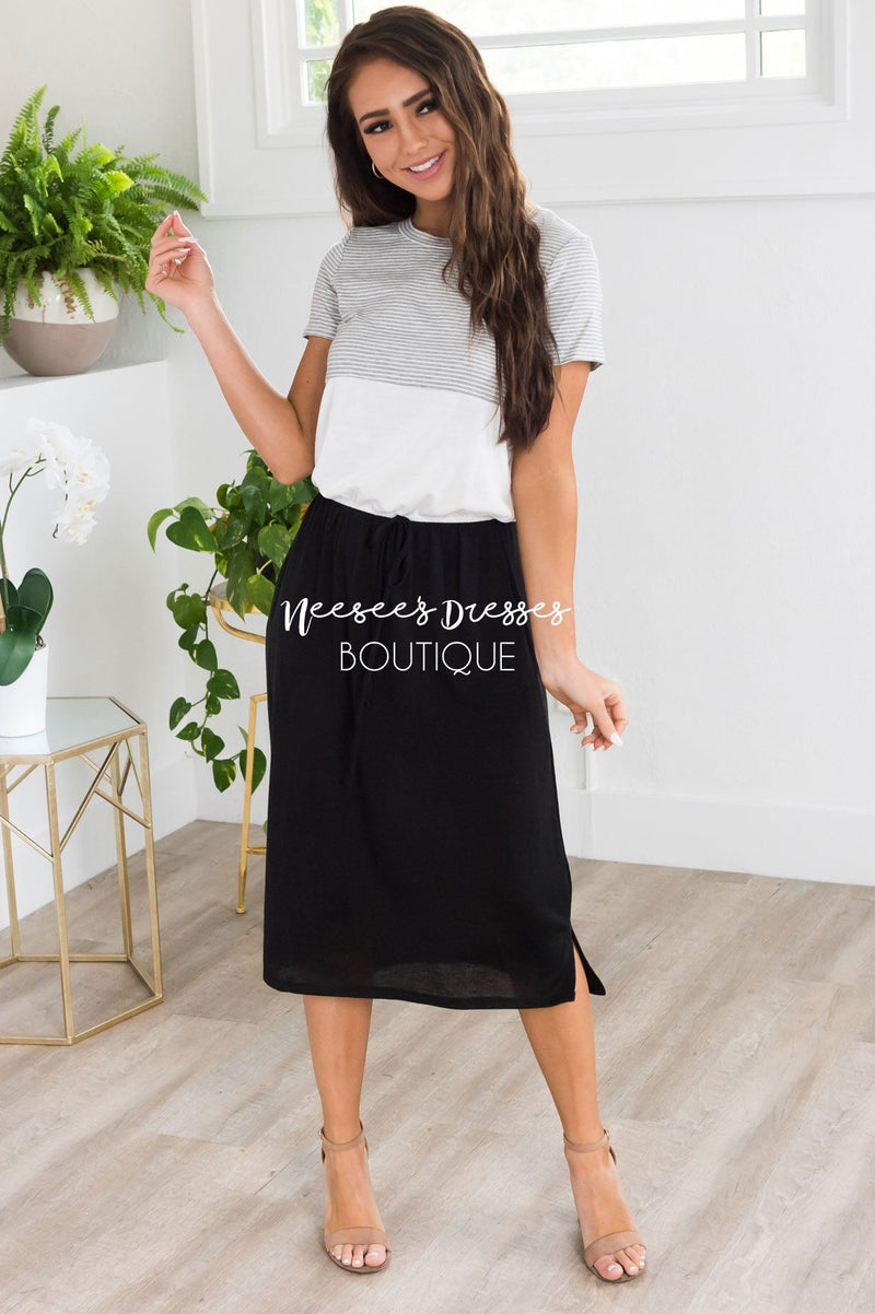 Talk about our new favorite casual summertime dress! This lovely new arrival has us seeing stars! Featuring a rounded neckline, lightweight breathable material, short sleeves, elastic waist with faux tie detail, and a flowy skirt with modest hemline side slits.