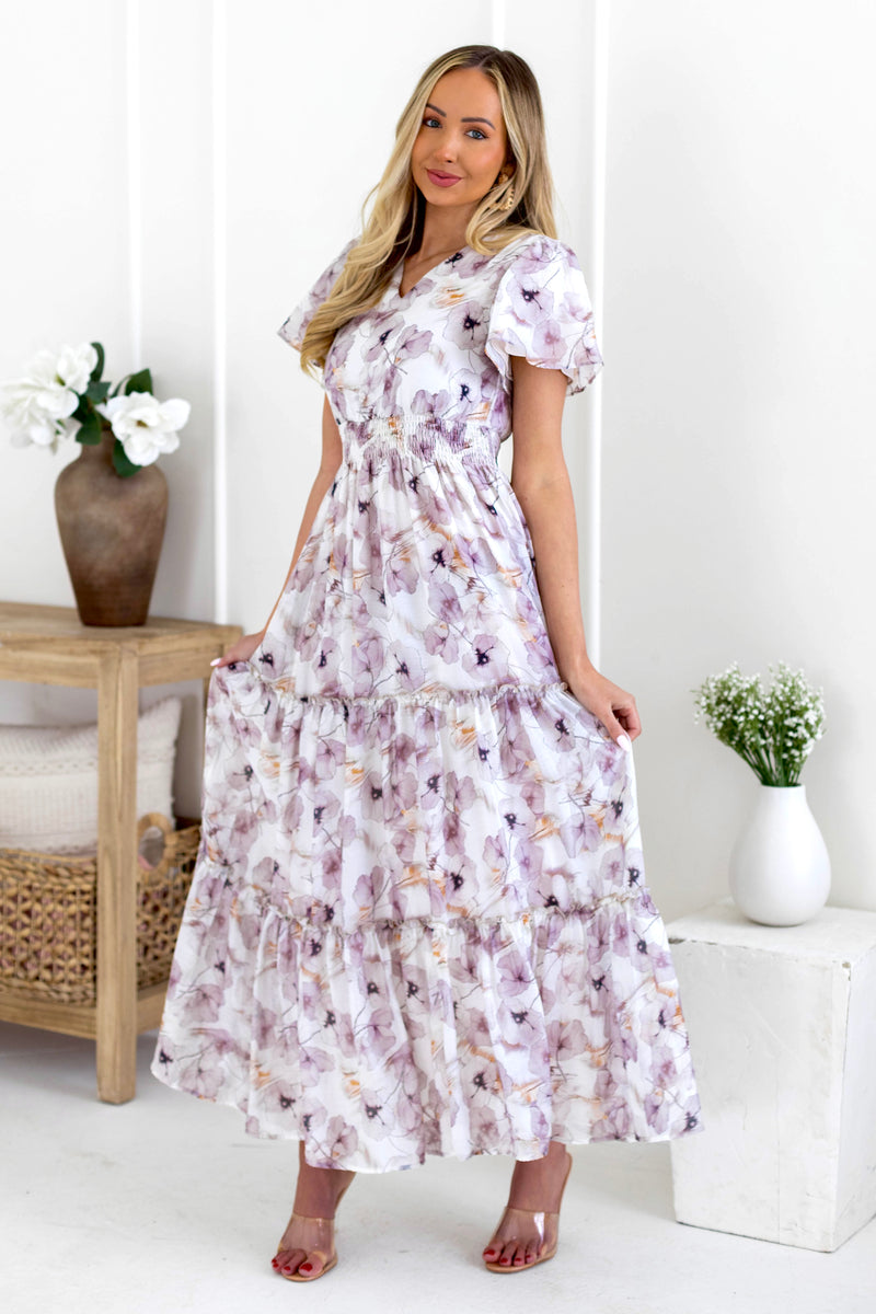 Elegance at its best! The darling new Eden dress has got our attention and we are sure it will have yours too! Soft V-neckline, gorgeous short flutter sleeves, a flowy ruffle tier maxi skirt, what more can we say?! This beautiful floral print has stolen our hearts! This dress is also fully lined except for those lovely flutter sleeves and has a shirred elastic waistband.