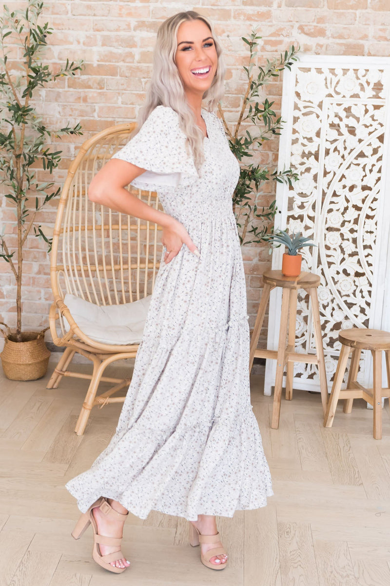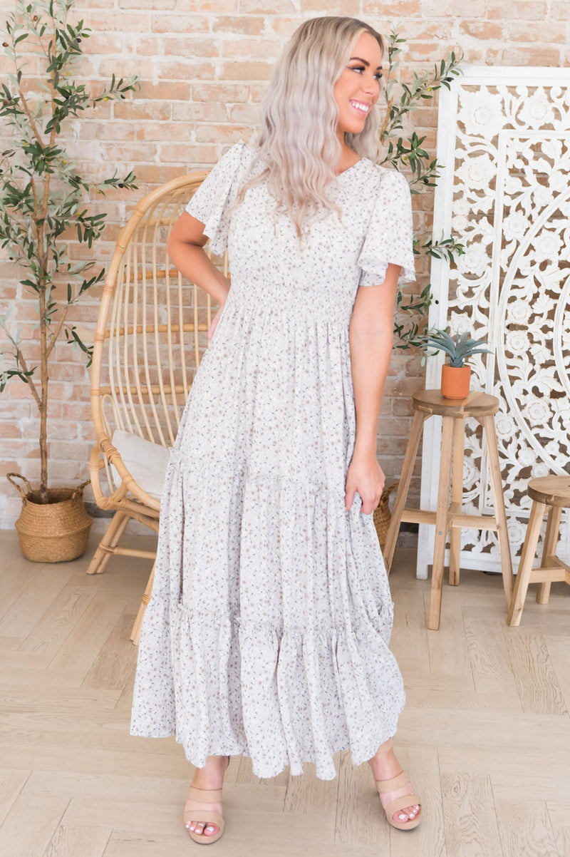 Elegance at its best! The darling new Eden dress has got our attention and we are sure it will have yours too! Soft V-neckline, gorgeous short flutter sleeves, a flowy ruffle tier maxi skirt, what more can we say?! This light pink beauty has stolen our hearts! This dress is also fully lined except for those lovely flutter sleeves and has a shirred elastic waistband.