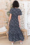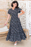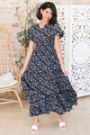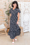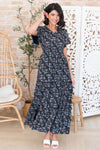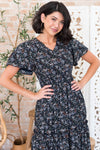 Elegance at its best! The darling new Eden dress has got our attention and we are sure it will have yours too! Soft V-neckline, gorgeous short flutter sleeves, a flowy ruffle tier maxi skirt, what more can we say?! This Dark Navy Orchard beauty has stolen our hearts! This dress is also fully lined except for those lovely flutter sleeves and has a shirred elastic waistband.