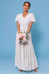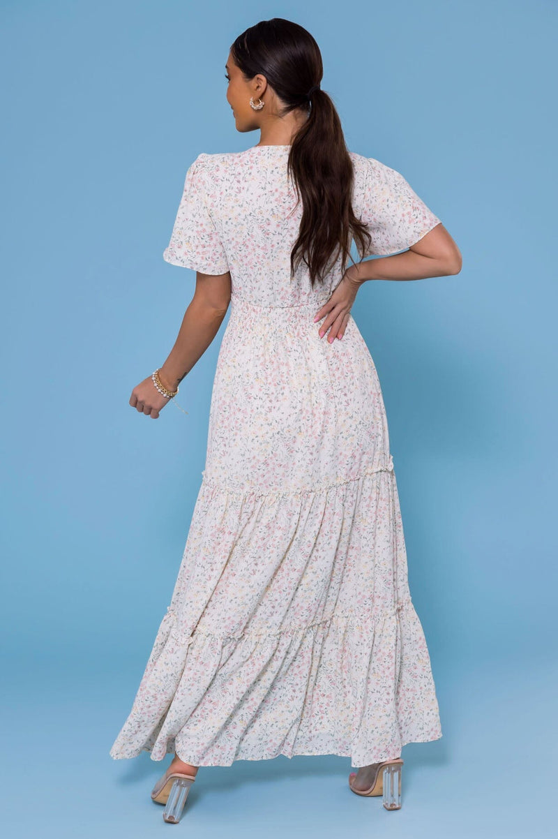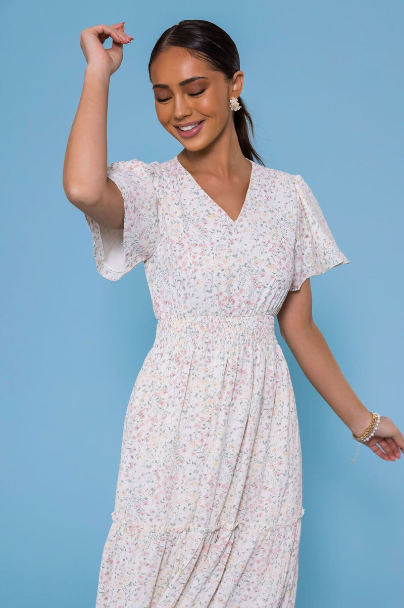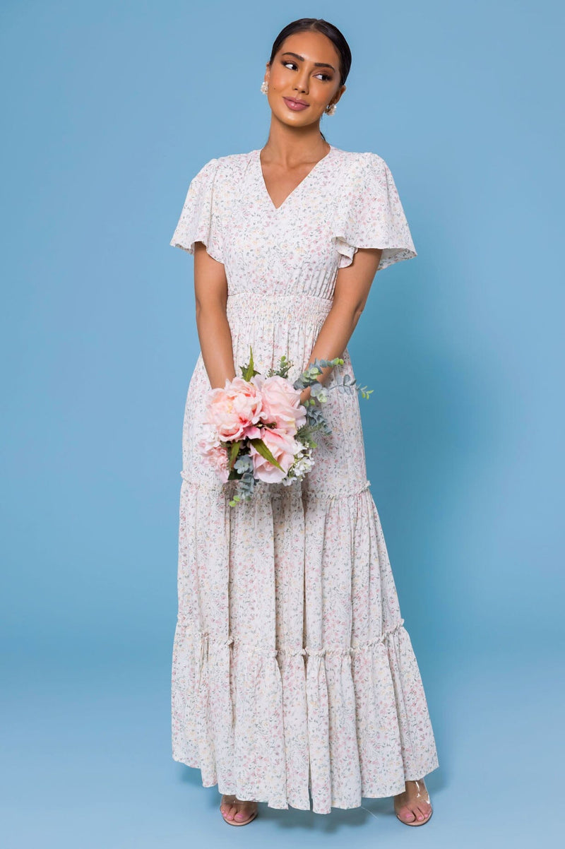 Elegance at its best! The darling new Eden dress has got our attention and we are sure it will have yours too! Soft V-neckline, gorgeous short flutter sleeves, a flowy ruffle tier maxi skirt, what more can we say?! This beauty has stolen our hearts! This dress is also fully lined except for those lovely flutter sleeves and has a shirred elastic waistband.