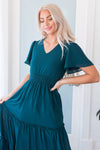 Elegance at its best! The darling new Eden dress has got our attention and we are sure it will have yours too! Soft V-neckline, gorgeous short flutter sleeves, a flowy ruffle tier maxi skirt, what more can we say?! This forest green beauty has stolen our hearts! This dress is also fully lined except for those lovely flutter sleeves and has a shirred elastic waistband.