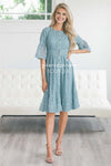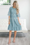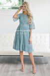 This dress is so simple yet so cute! Dress is up or dress is down, you can never go wrong! This dusty teal lace dress features a shirred waist, a button front, lace bell sleeves and a ruffle detail hem! This dress is also fully lined and nursing friendly!