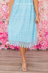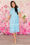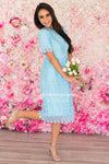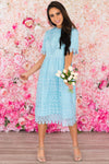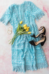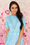 Beyond Stunning! Our Elly Dress has left us speechless! From the detailed crochet lace bodice detailing, to the pretty lace short sleeves, to the beautiful sky blue lace color, this dress has it all and more. Fully lined, zipper closure.