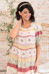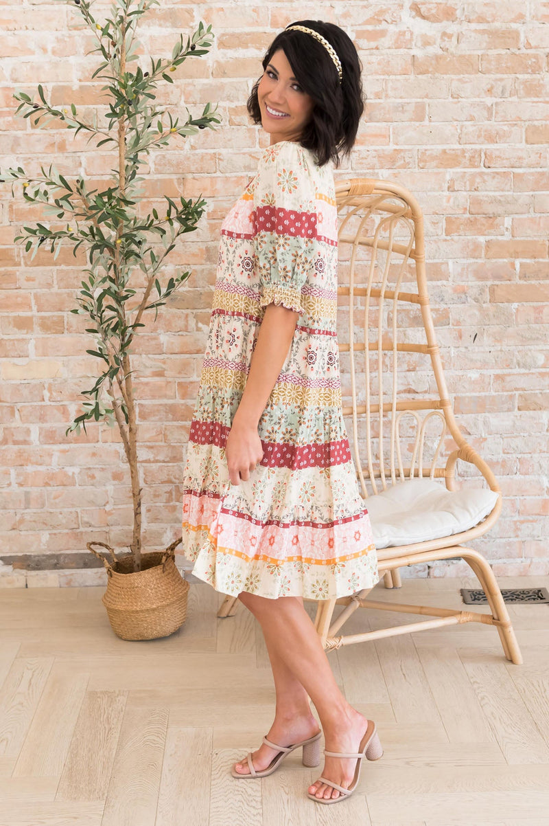 The Ellyn has all the most gorgeous features to include boho floral print, short puff sleeves, slip over fit and the most darling tiered ruffle skirt. This modest beauty is a true summertime must have!