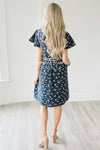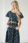 The Emerie is beyond adorable! This navy dress features an adorable mini floral print, flutter short sleeves, a gathered waist, yellow trim detailing, side pockets and a key hole back!