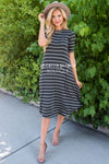 The most perfect lightweight summer dress has just arrived and we couldn't be more excited about it! This striped cutie is going to look so flattering on everyone and anyone. This dress features a higher neckline for the perfect amount of coverage, half sleeves and the most comfy, stretchy material around!