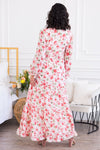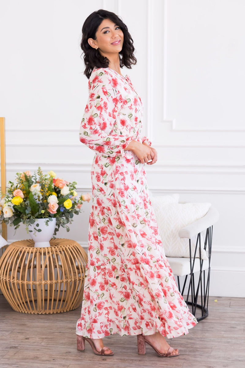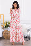 The Emilian modest floral dress is perfect from top to bottom! We adore this gorgeous color combination, modest round tie neckline, long ruffled sleeves and feminine double ruffle hem maxi skirt! This darling dress is seriously perfect for any season, grab yours today!