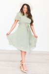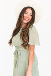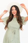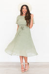 The Emiliana is an absolute favorite from our summer collection! This beautiful fern green colored dress has many stunning features, such as a rounded neckline, an elastic waist with a belt tie, dainty ivory leaf print throughout, short flutter sleeves, and a pleated skirt! This dress also has lining throughout the body and skirt, only excluding the sleeves! This dress is a must have!