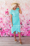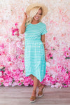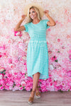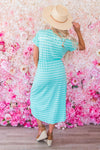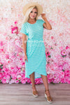 The Essie is back and now in a new color and pattern! We love the mint and ivory stripes, it give the Essie the perfect pop of color! Featuring a round neckline, short sleeves, super soft and cozy material, elastic waist and last but not least the most feminine wrap skirt. Get yours today!