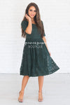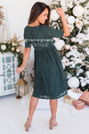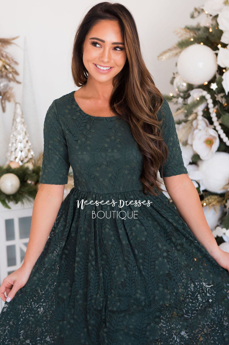The perfect holiday dress just arrived and we cannot be more excited! This new lace dress features a stunning shade of emerald, brand vine lace overlay, a scoop neck line, half length sleeve, a fitted gathered waist and knee length skirt. This dress is also fully lined.
