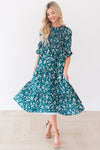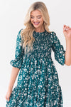 The Evalina has a beautiful smocked top and tiered skirt covered in a delicate ivory floral pattern. This charming and modest dress will be sure to fit for any occasion! We love the deep emerald green color too!