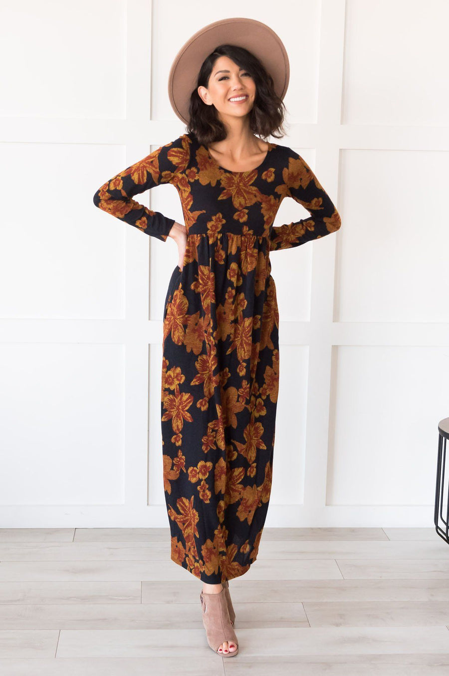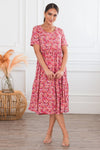All eyes on you in the amazing new Evonne floral! Features include the loveliest feminine floral print, modest round neckline, short sleeves and the flowiest skirt around! Get yours today!