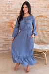 The gorgeous Fallina has arrived just in time for Spring! We are loving the long sleeves, the beautiful dusty steel blue color, dainty modest tie neckline, and ruffle detailing on the bodice and hem! You can't go wrong with this one, get yours today!