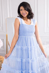 The delicate Farris is here to sweep you away! Featuring the most elegant baby blue tulle color, it has all the most feminine details to keep you feeling gorgeous all day and night long! The smocked bodice and ruffle tiered skirt are flattering to all! Get yours today!