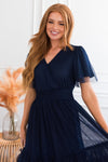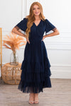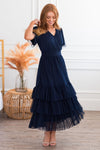 Taking in all the frills with the gorgeous new Fauna! Featuring a rich navy color, flowy tulle ruffled skirt, a cross-over bodice and lovely tulle flutter sleeves. I don't even think we have to tell you to add this one to your cart now! It will not last long!