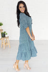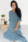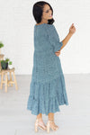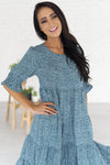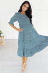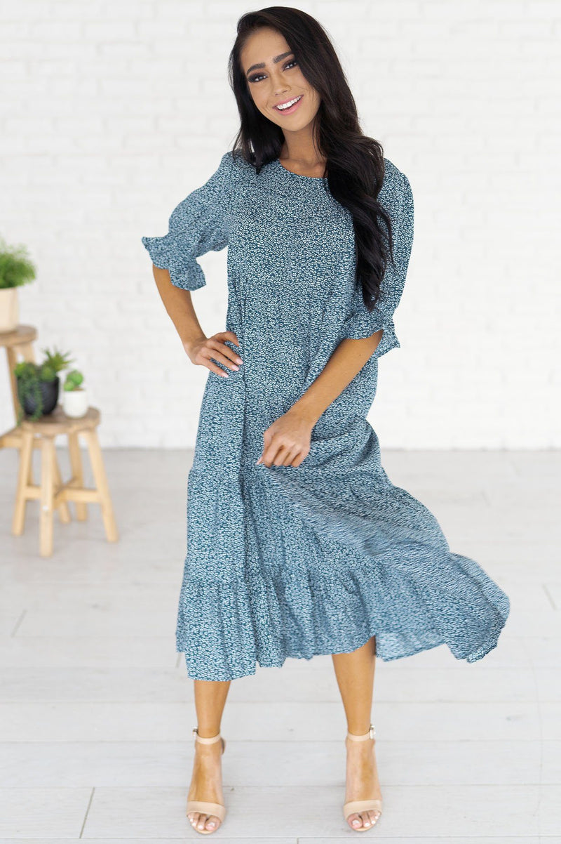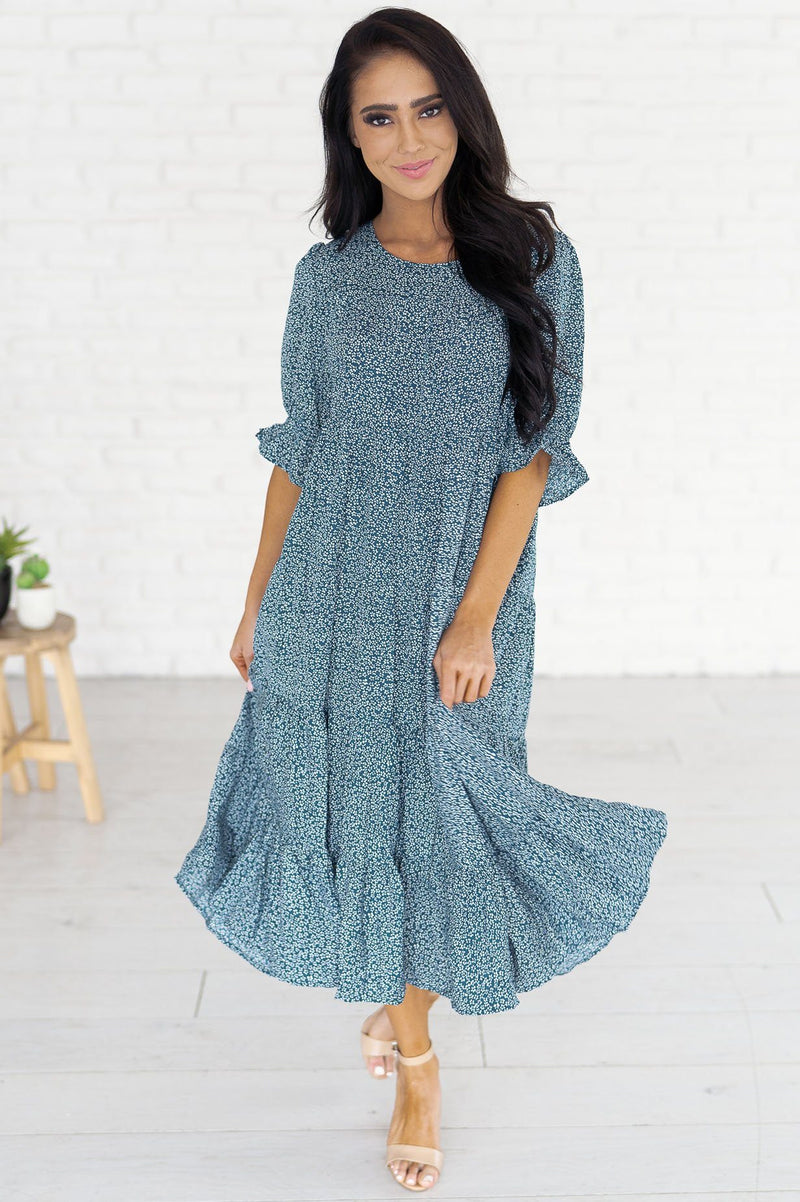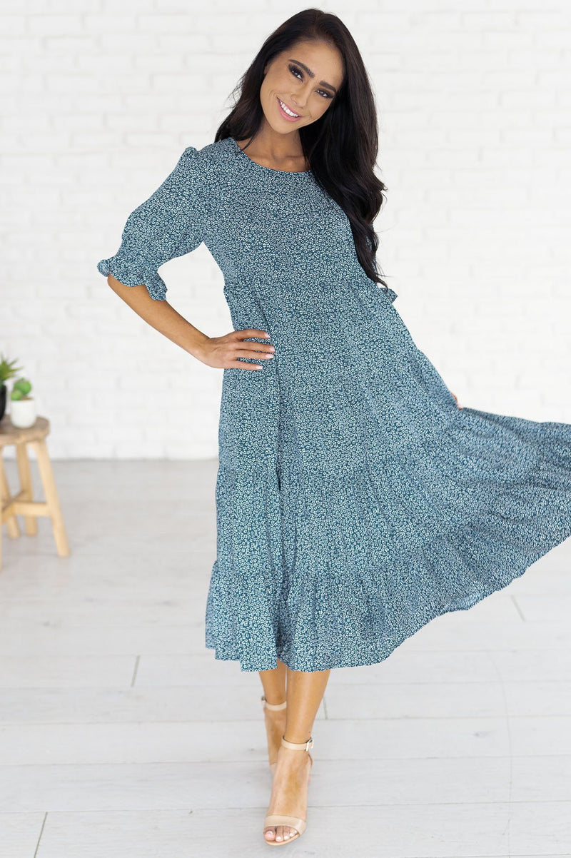The perfect tiered dress is here just in time for fall! We simply can not get over the lovely teal and white floral print, short puff ruffle sleeves, and tiered flowy skirt! Grab your favorite hat and booties, modest style at it's best!