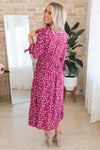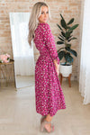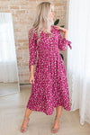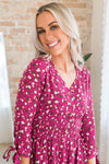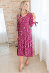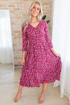 This stylish and fashionable dress will be perfect for you! The dainty green and ivory floral print, gorgeous magenta color, functional button down front, cinched waist, and tie detailing on the 3/4th length sleeves will make you want this dress now! The dress is lovely, flowy, lightweight and perfect for the spring! This beauty is also nursing friendly!