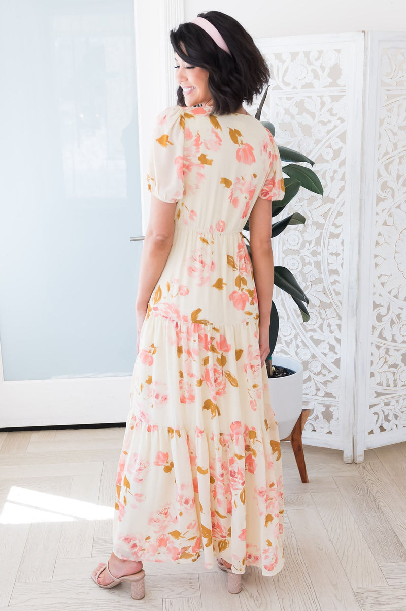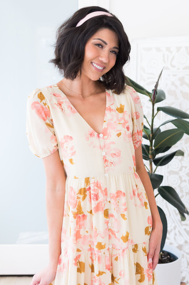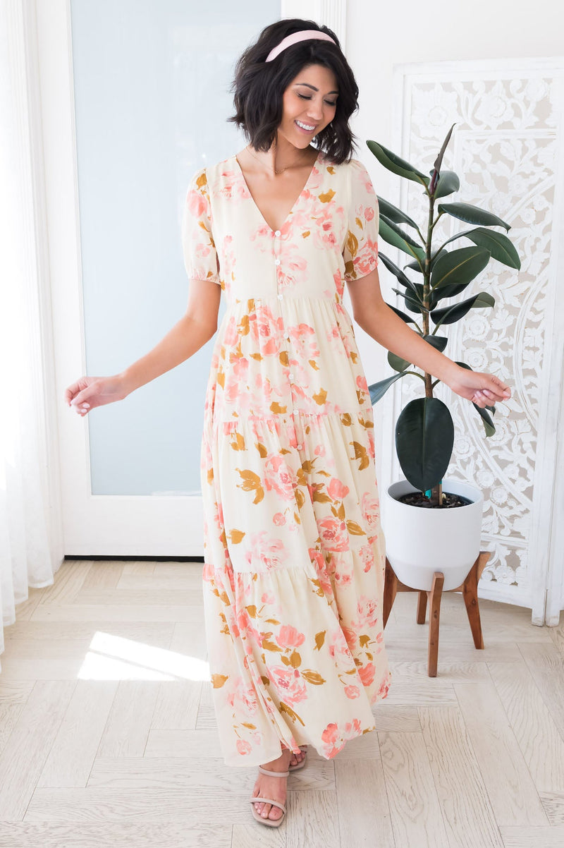Our new flowy Franceen dress is absolutely stunning from head to toe! Featuring a modest functional button front, making this one nursing friendly! The most beautiful white and blue floral print, short sleeves, & maxi length. You cannot go wrong with this beauty. Get yours today before they are all gone.