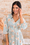 The gorgeous Francyne has arrived just in time for Spring! We are loving the quarter length puff sleeves, the beautiful sage color, dainty taupe & cream floral throughout, and soft v-neckline button front bodice detailing! You can't go wrong with this one, get yours today!