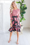 This darling Geena dress has stolen it's way into our hearts! Lovely grey & burgundy floral fabric creates such a classy piece! Featuring a lovely bow tie detail at the waistline, 3/4 length fitted sleeves, elastic waist and a full flowy skirt. You are going to want this added to your wardrobe, trust us!