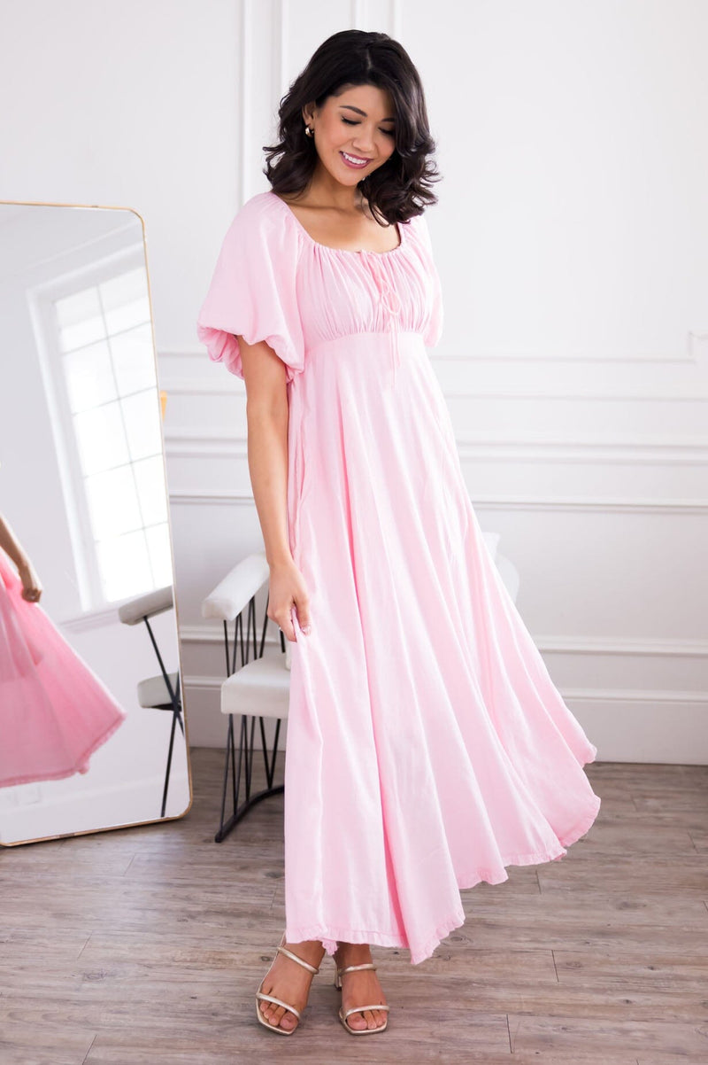 The perfect dress is about to find you! The lovely babydoll Gemiah is a showstopper! Featuring slip on style, modest round neckline with tie detail, puff sleeves and a flowy ruffle hem handkerchief skirt, we are obsessed! Get yours today!