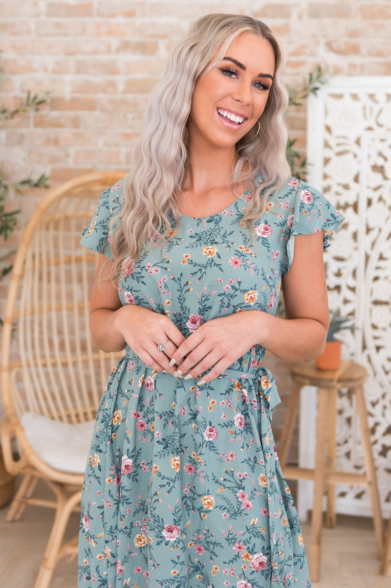 The dreamiest of dresses has just arrived! The Gennifer is the perfect dress for Fall! This perfect combination of Fall colored floral is sure to sell out fast! Be sure to add to cart now! Features include, short flutter sleeves, belt tie waistline and flowy mid-length skirt. We know you're going to love it!