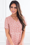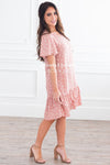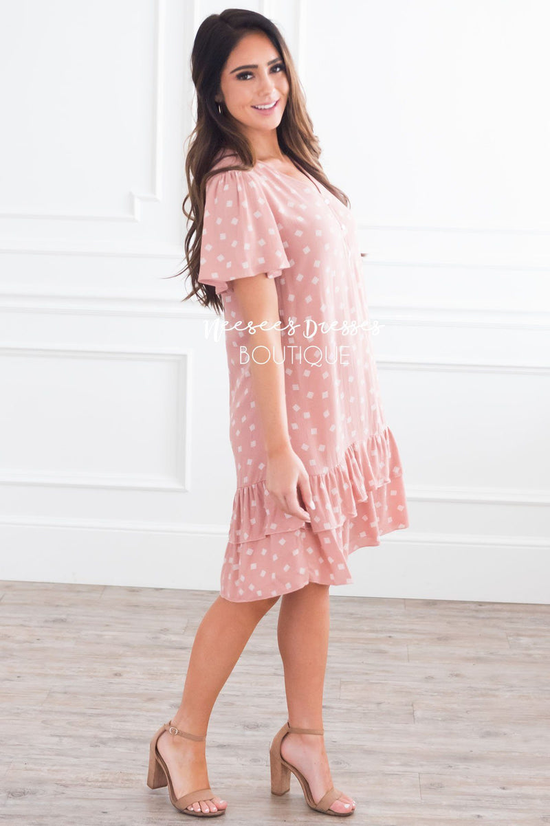 We are loving every beautiful detail about this new dress! The Georgia dress features a v-neckline with faux button detailing, short flutter sleeves, shift style cut and the most feminine double ruffle hemline. We also love the geometric pattern print! Get yours today!