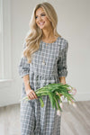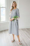Our Gia dress is adorable! Beautiful black plaid dress features a gathered waistline , asymmetrical button up front and hidden pockets. Nursing friendly and fully lined.