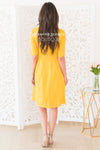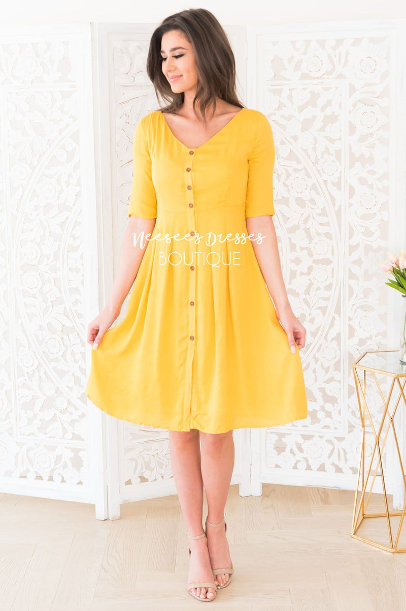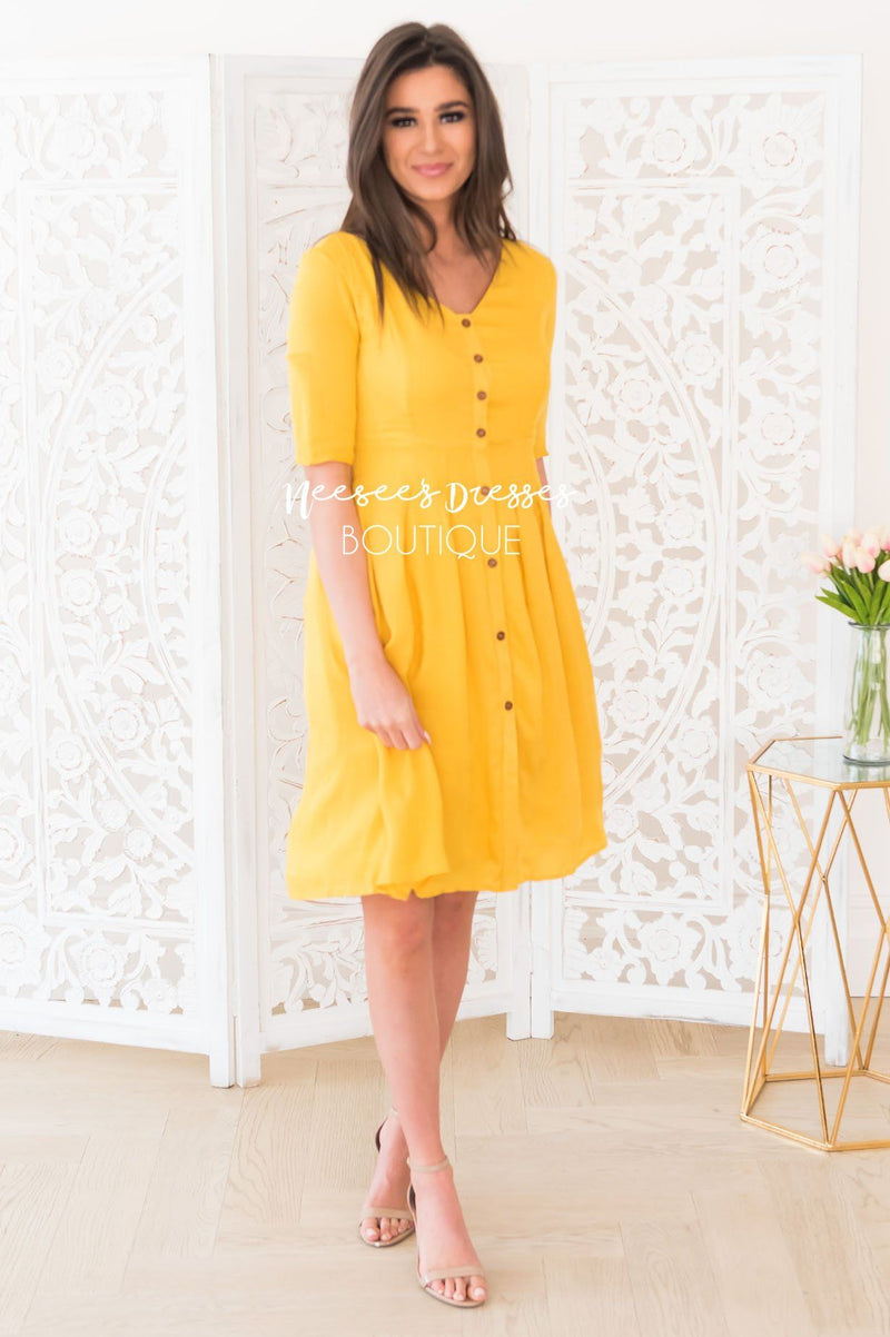 Make a bold statement this winter in this stunning gold dress! The Gina is sure to turn heads at any event! Gold dress features a button front, v neck line, princess pleats through the bodice, a fitted waist with pleats, 1/2 length sleeves and knee length skirt. This dress is also fully lined