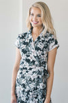 The Gloria is a must have! This new floral print is one of our new favs! This dress features a wrap style skirt an beige and jade floral print, cross over front and short sleeves!