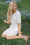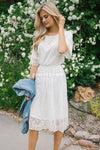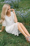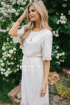 Prepare to fall head over heals in love with our gorgeous new Gracie Dress! This dress features a lace over lay with the cutest embroidered details, half sleeves, a gathered waist band