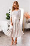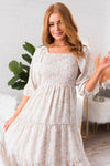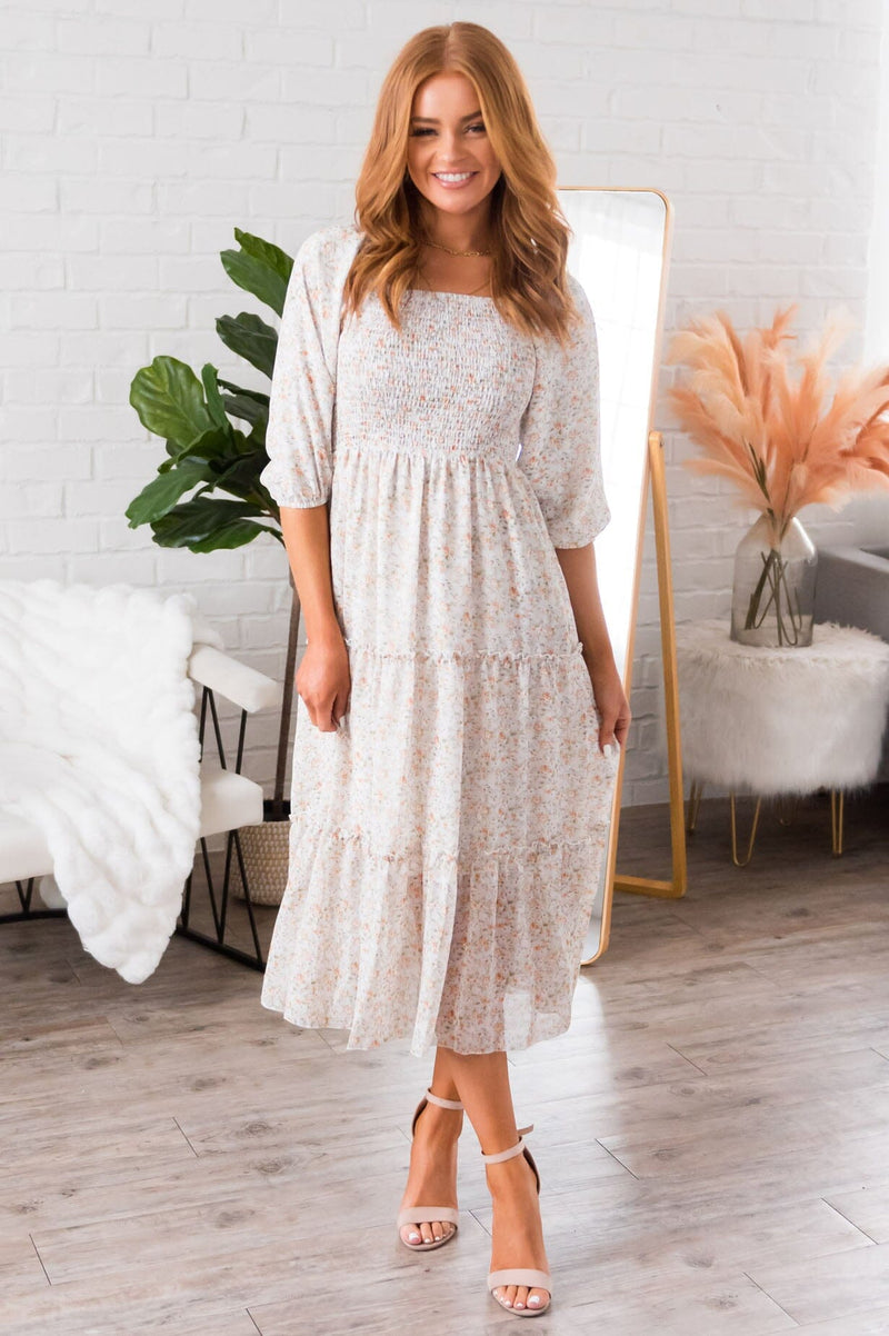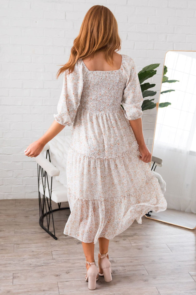 The Greta is perfect from top to bottom! We adore the tiered skirt, square neckline and smocked bodice beyond measure! The Ivory, pale blue & apricot floral and flowy material together creates an elegant, yet boho feel! And the quarter length sleeves are oh so pretty!