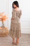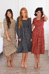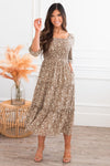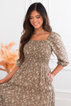 The Greta modest dress is perfect from top to bottom! We adore the tiered skirt, square neckline and smocked bodice beyond measure! The roasted cashew floral and linen material together creates an elegant, yet boho feel! The quarter length sleeves are oh so pretty!