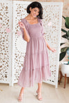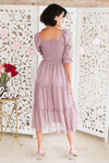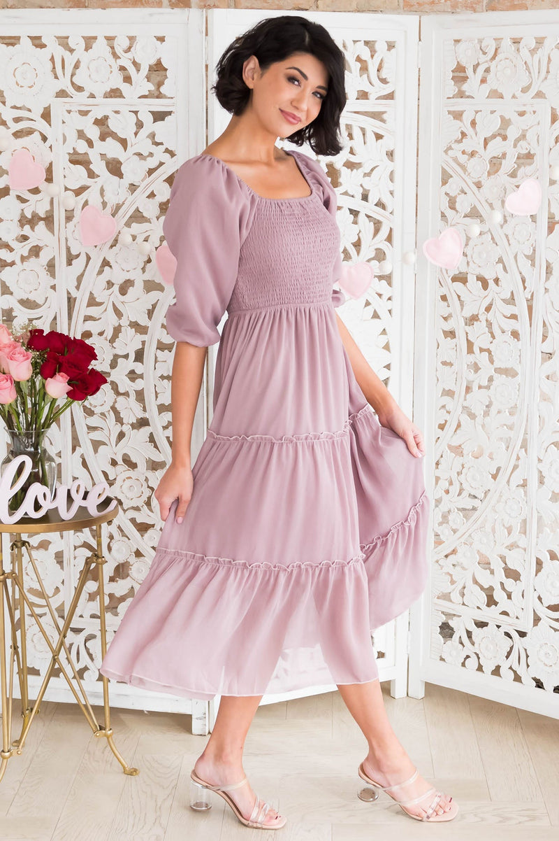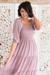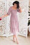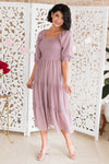 The Greta modest dress is perfect from top to bottom! We adore the tiered skirt, square neckline and smocked bodice beyond measure! The twilight mauve color and linen material together creates an elegant, yet boho feel! The quarter length sleeves are oh so pretty!