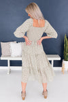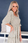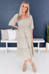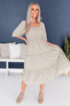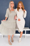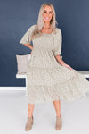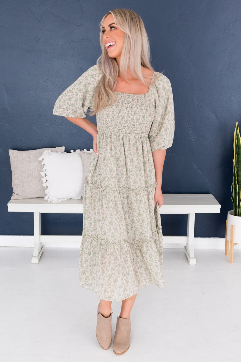 The Greta modest dress is perfect from top to bottom! We adore the tiered skirt, square neckline and smocked bodice beyond measure! The light tan & sage floral print and linen material together creates an elegant, yet boho feel! The quarter length sleeves are oh so pretty!