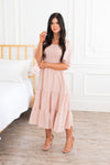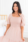 If you have been on search for the perfect Springtime dress, we have the one for you! Our new, modest, Guinevere Dress, is so feminine and beautiful. Featuring a lovely square neckline with ruffle trim on shoulders, half puff sleeves, a flattering ruche bodice, an elastic waist, and a tiered flowy skirt.