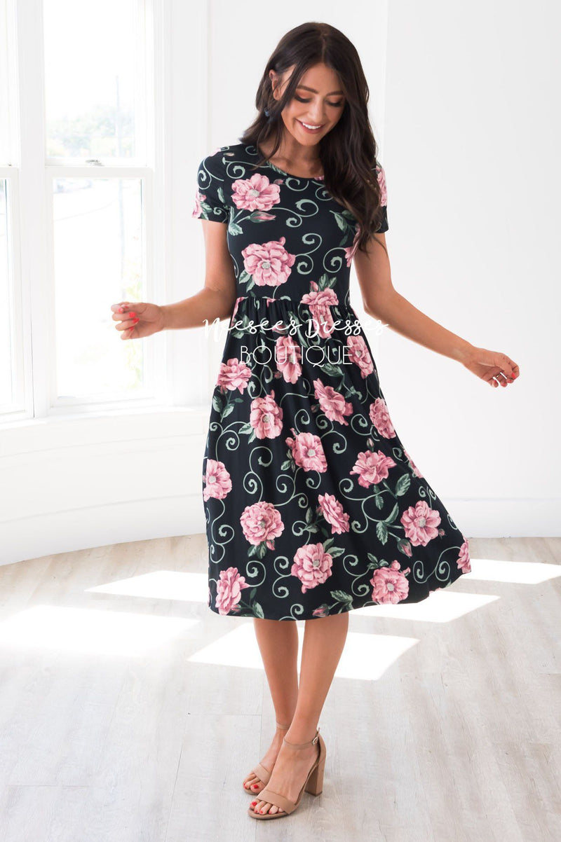 The Gwenivere dress is one you are going to want to join your wardrobe! This modest floral beauty is made out of the softest ever material! Featuring a rounded neckline, short sleeves, elastic waist, pockets and the perfect modest mid-length! Get yours today!