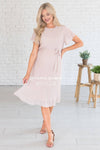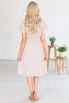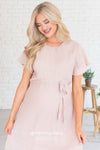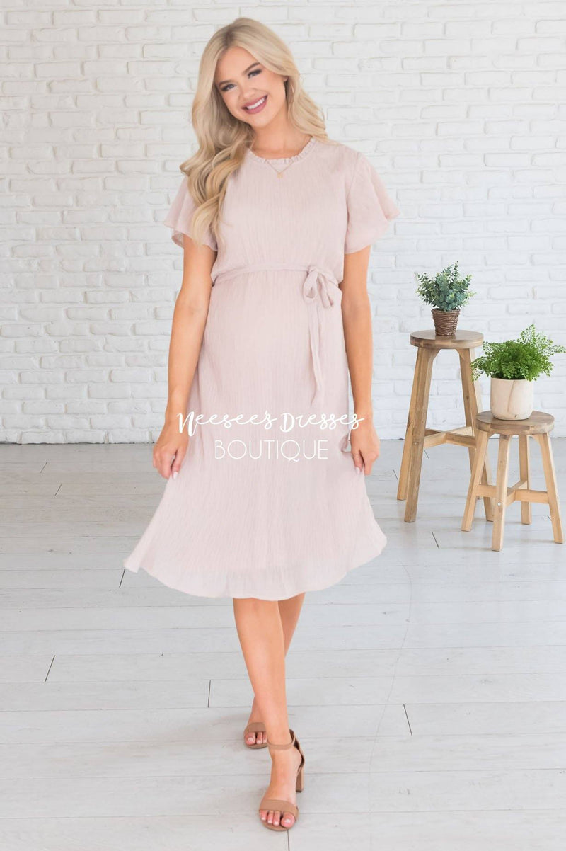 The darling Hadlie is bound to take your breath away! Soft feminine sheer crepe fabric in the not to mention, oh so fabulous beige pink shade! We simply can not get enough! Also features, modest round ruffle neckline with keyhole button closure, short flutter sleeves and a belt tie waist. Get yours today!