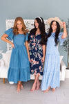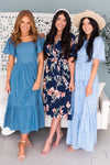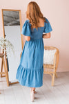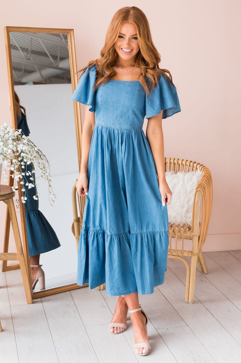 The Hadly swooped in and stole our hearts! This lovely cotton medium wash denim dress has all the best features! To include, half length flutter sleeves, squared neckline with sweetheart stitching on the bodice and a full flowy maxi skirt. Get yours today, these beauties will go fast!