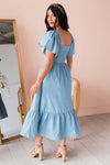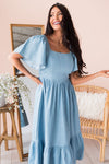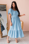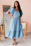The Hadly swooped in and stole our hearts! This lovely cotton light wash denim dress has all the best features! To include, half length flutter sleeves, squared neckline with sweetheart stitching on the bodice and a full flowy maxi skirt. Get yours today, these beauties will go fast!