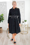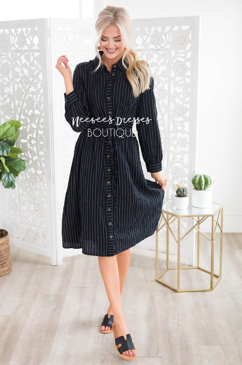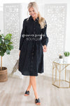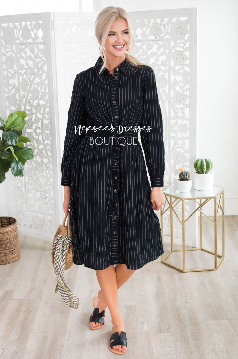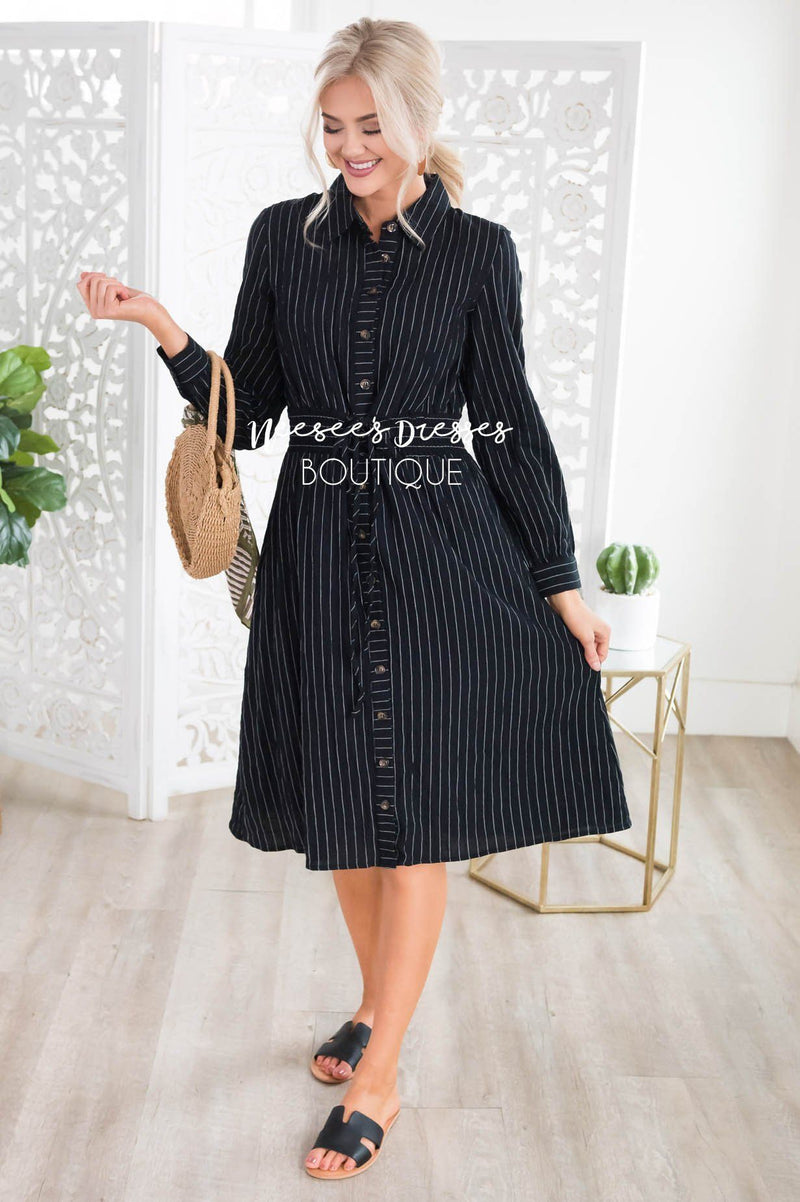 The fit and style of this modest dress has got us head over heals in love! Featuring a functional button front, long sleeves, and a lovely classy collar neckline. Our most favorite feature of this beauty is the wide elastic waistline with lace up belt tie. Get yours today before they are all one!