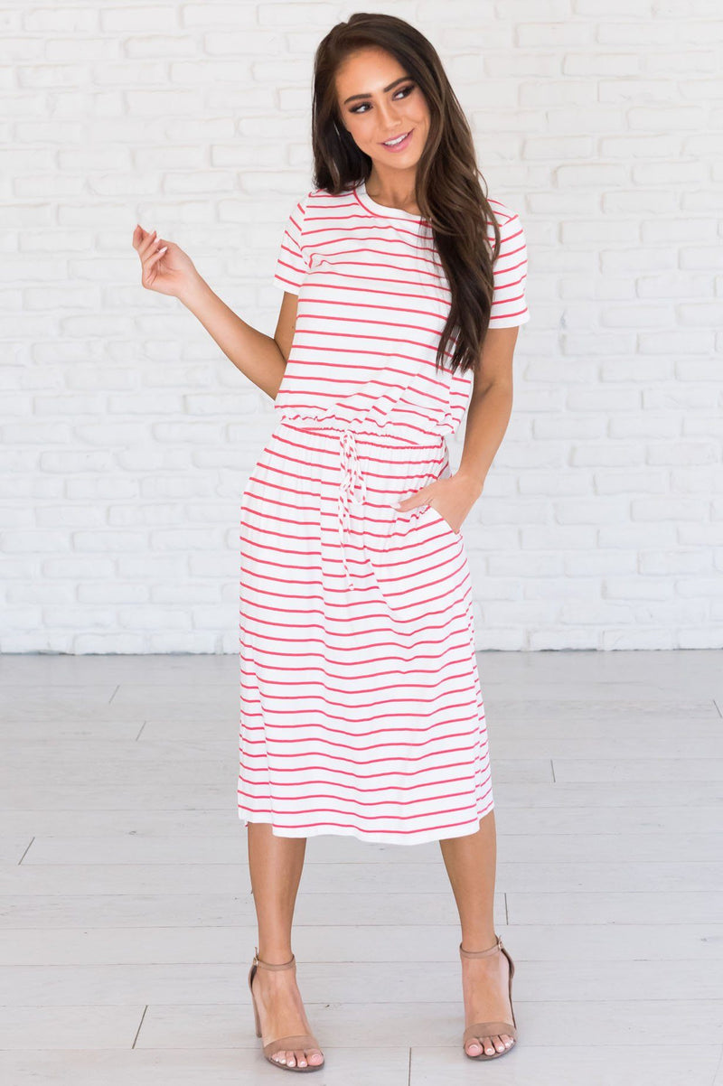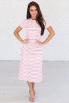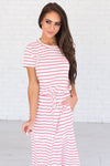 The Hannah is one of our all time favorites and now in a new color! We love the ivory and coral striped color, perfect for any season! Featuring a round neckline, short sleeves, super soft and cozy material and a drawstring waist. Get yours today!