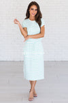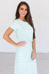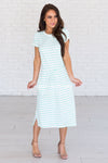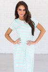 The Hannah is one of our all time favorites and now in a new color and pattern! We love the mint stripes on the ivory, it give this Hannah the perfect pop of color! Featuring a round neckline, short sleeves, super soft and cozy material and a drawstring waist. Get yours today!