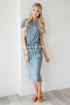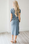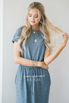 The Hannah is just what you have been looking for! This dress is perfect for the fall days to come! This dress features a dusty navy color, an elastic tie waist, short sleeves and side pockets!