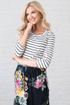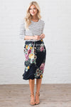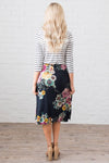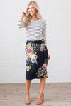 This gorgeous modest dress is so effortlessly cute! Featuring an ivory with black striped bodice, a black floral knee length skirt, 3/4 length sleeves, an elastic waist with a tie detail and side pockets.