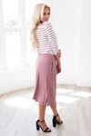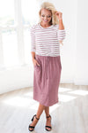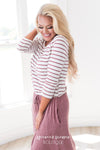 The Hannah Ann is one of our all time favorites and now in a new color and pattern! We love the mauve stripes on the ivory, it give this Hannah Ann the perfect pop of color! Featuring a round neckline, short sleeves, super soft and cozy material and a drawstring waist. Get yours today!