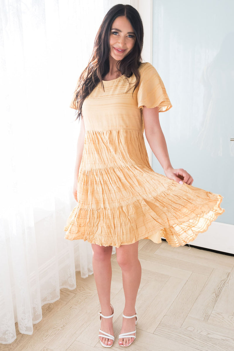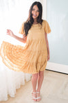 We are so excited about our new Hannah! This dress is seriously so perfect for summer and spring! We love the beautiful light marigold yellow color, horizontal knit texture throughout, modest round neckline, and flowy short sleeves! You will love the Hannah, get yours today!